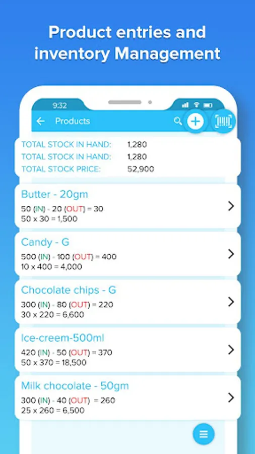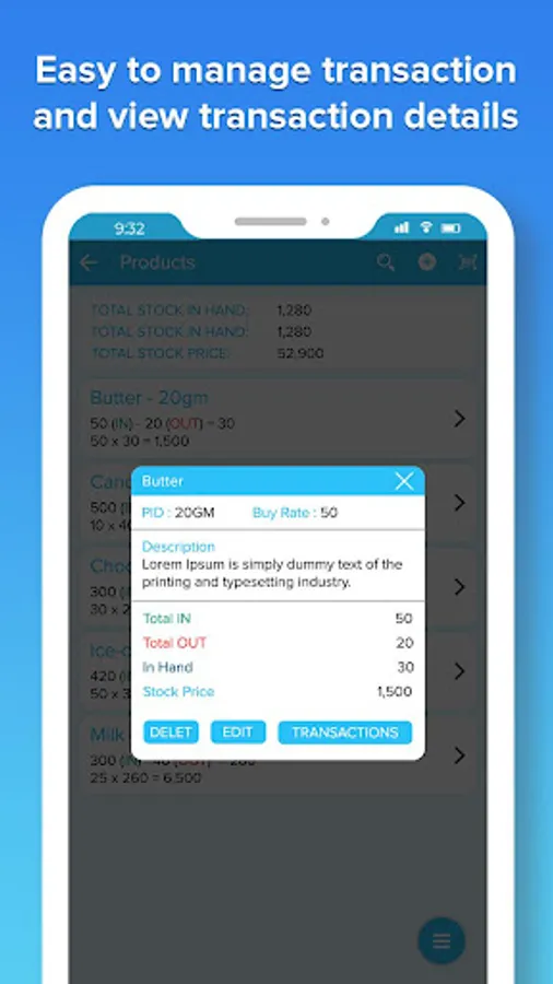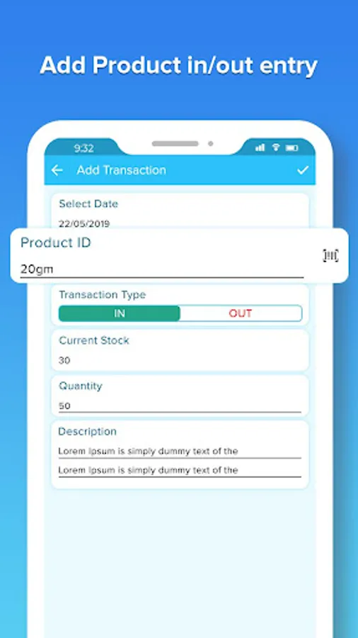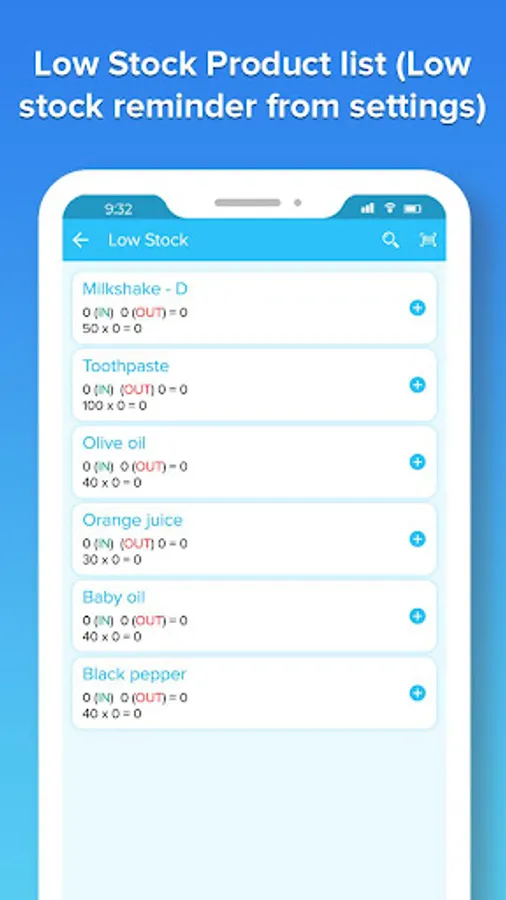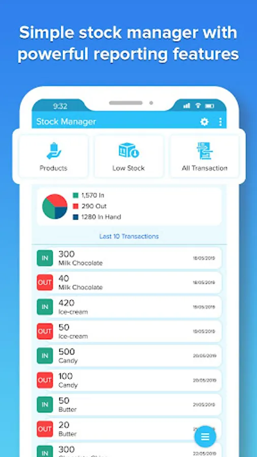 App allows you to add in or out product transactions. App shows low stock products so that you can decide what to buy to control inventory. You can set low product limit from settings.