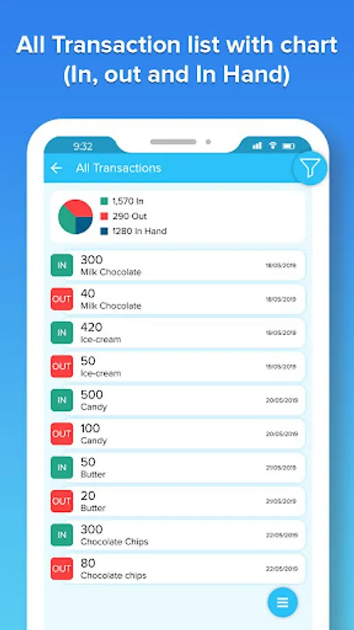 - Pie chart of in, out, and in hand stock helps you to easily analyze the stock.