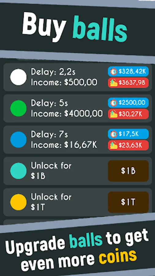 Balls can also be improved, namely profit and the speed of appearance. You can also unlock new balls for coins. Each new balls give more than the previous ones.