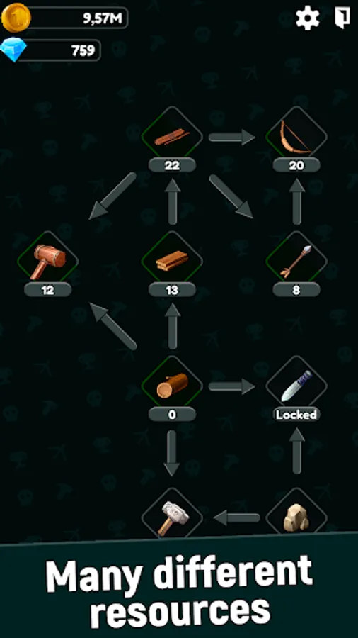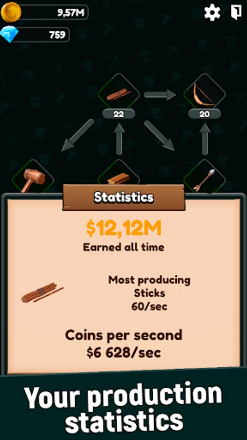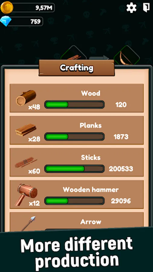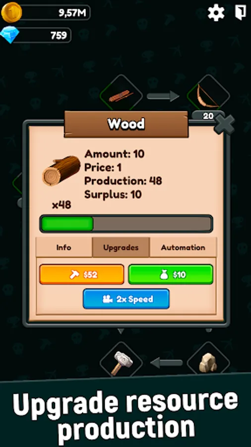 Craft resources, upgrade their production. Each item has its own recipe, look carefully at the stability of production, because some resources may lack other resources!