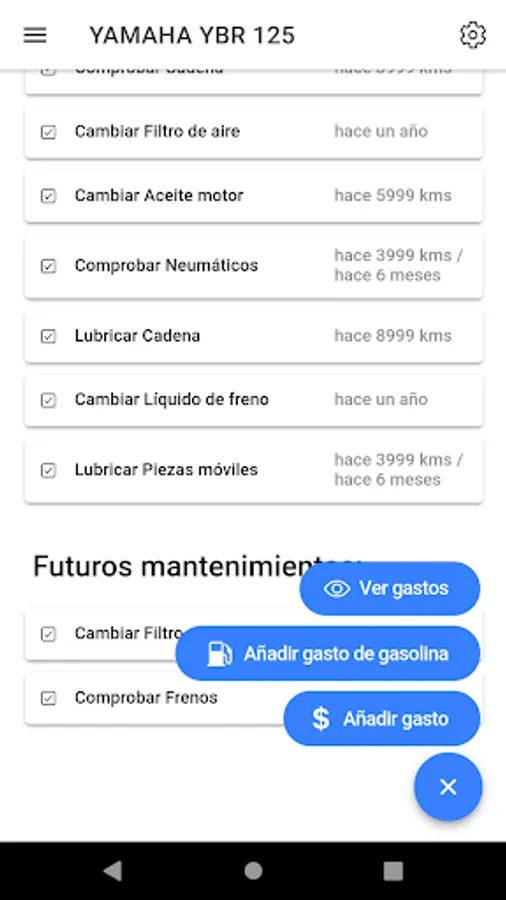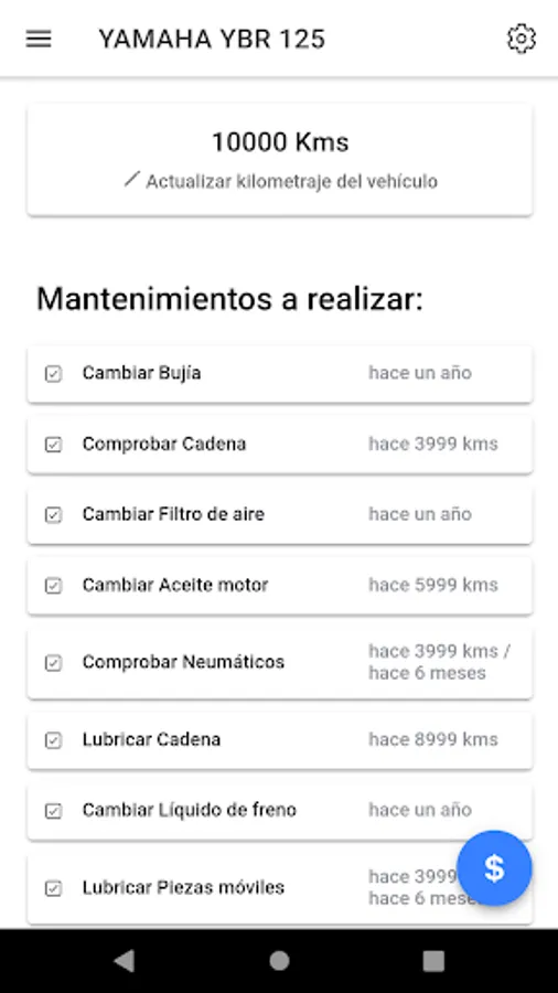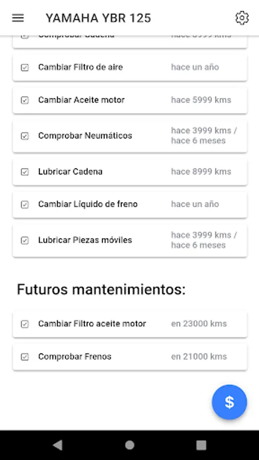 When you add one of your vehicles, Motorapp will automatically create all the maintenance and repairs that you must perform on your car. Indicating every few kilometers or how often they must be done. These maintenance and repairs are generated automatically by an average of vehicles similar to the characteristics of your vehicle, extracted from their respective vehicle owner's manuals and automobile repair manual.
