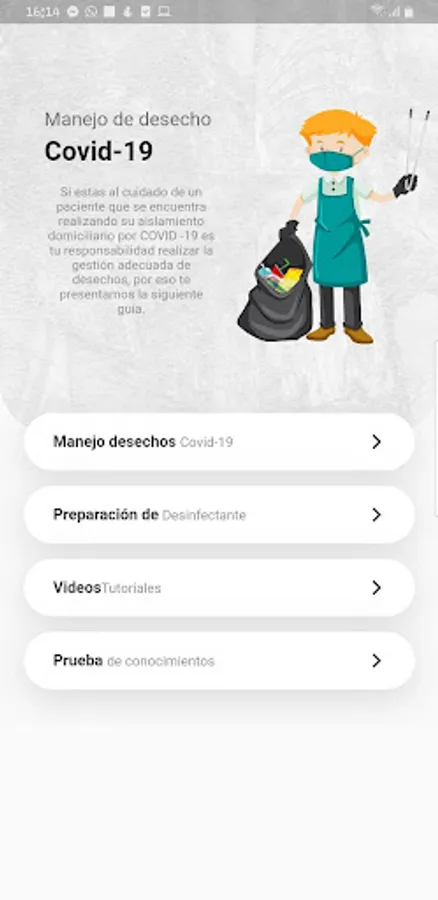 It explains a series of steps that must be carried out to carry out good waste management in patients with home isolation and thus obtain fewer infections around them, it also has tutorial videos and a game of questions to interact with the application