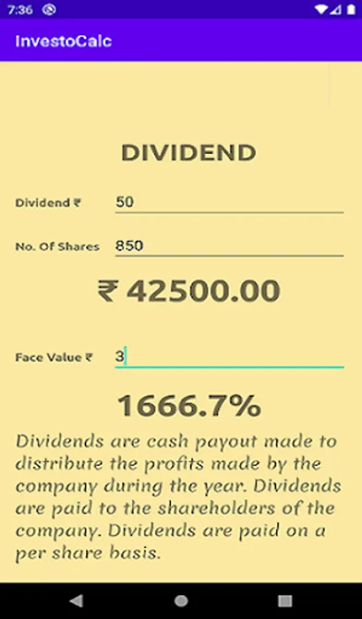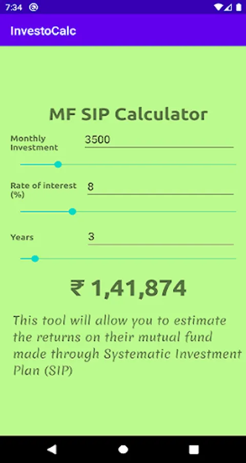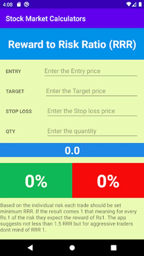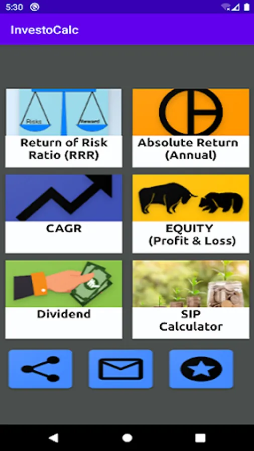 A collection of useful calculator's which you helps to calculate the easily on your investments. It has help you to identify Returns of Risk Ratio (RRR), Equity profit & loss, CAGR, Annual returns, Dividend and SIP Calculator.