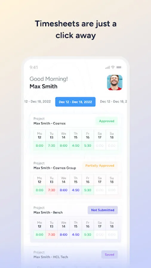 Timesheet App tracks employees’ time and efforts in all their assigned projects, with real-time status updates.