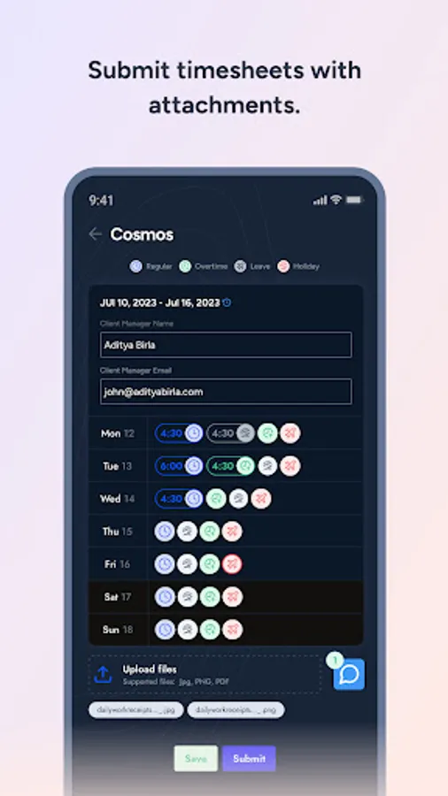 - Submit timesheets with attachments.
