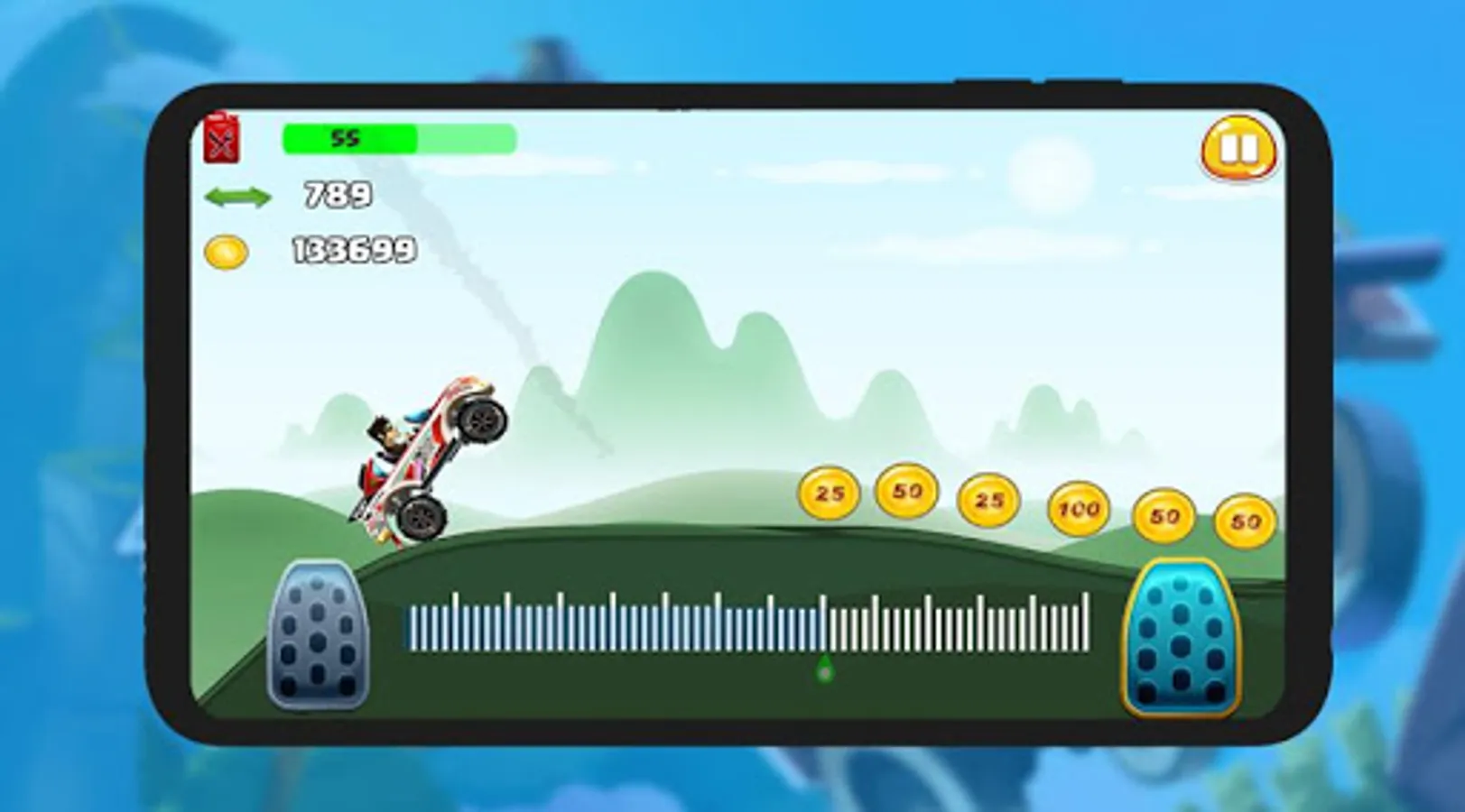 Get ready to play for the Rugged Mountain Race, the fun type of Off Road racing. Get ready for all the details in a fun game. 15 different episodes with 20 different maps will enjoy a fun way off road gaming. In the game you can increase the power of the vehicle can increase the power of your suspension can increase your fuel savings and faster and more powerful vehicle engine can go with the department. If you have difficulty in collecting gold, you can buy gold from the store and immediately upgrade your vehicles to enjoy the game.