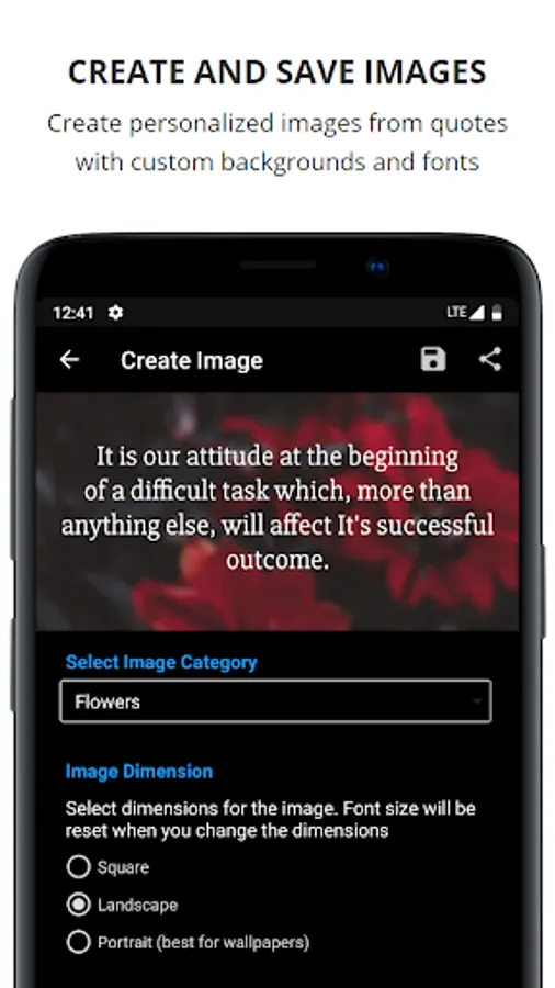 * Create and save personalized images from quotes. Custom fonts are loaded from Google Fonts, and images are loaded from Unsplash. You can also set the images as wallpapers from inside the app.