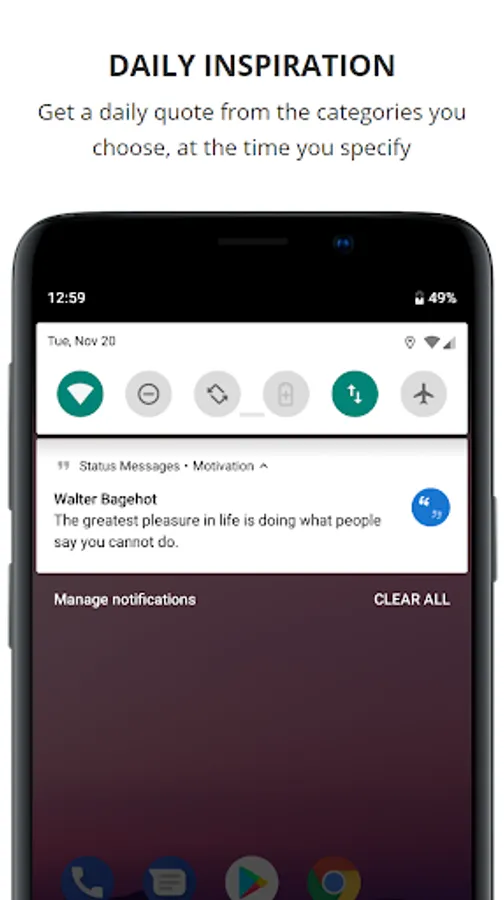 * Get a daily quote in your notification tray, from the categories you choose, at the time you like.