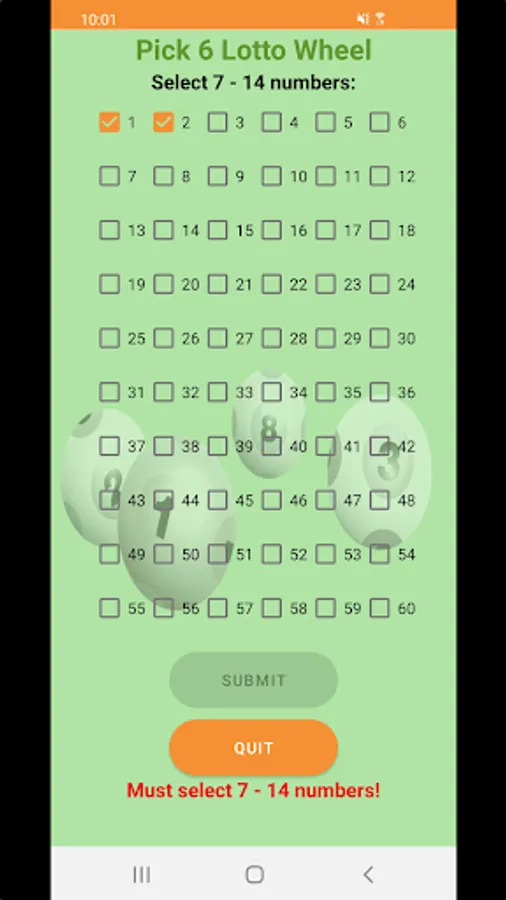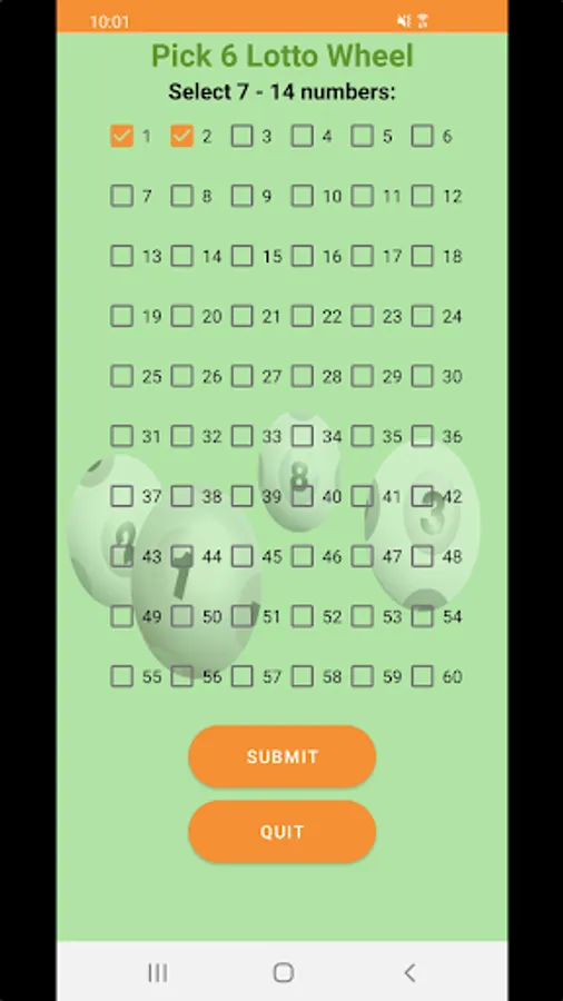 Pick 6 Lotto Wheel is not an gambling App, it is only used to select numbers to play at your local shop or online with third party apps. Pick 6 Lotto Wheel is an fun and entertaining wheeling strategy of playing lottery numbers. There is no guarantee to win the lottery but the player's winning odds are improved.