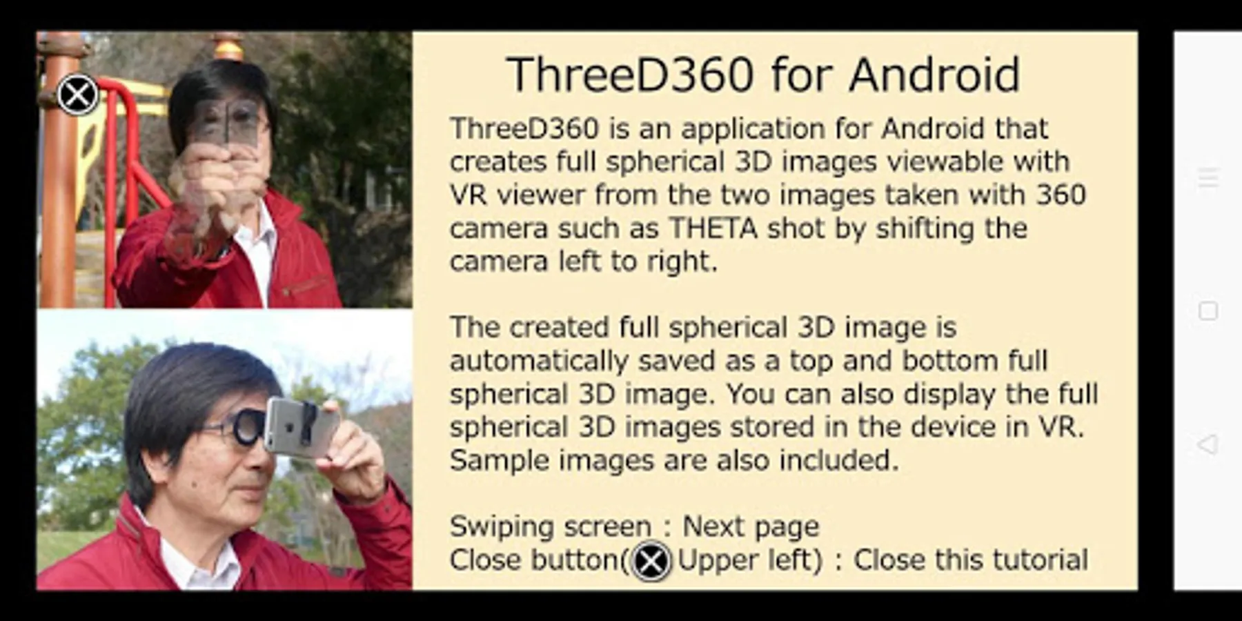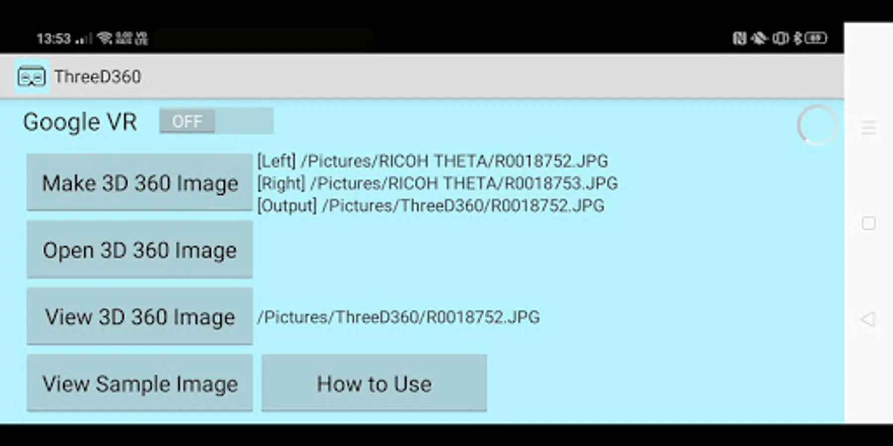ThreeD360 is an application for Android that creates full spherical 3D images viewable with VR viewer from the two images taken with 360 camera such as THETA shot by shifting the camera left to right.