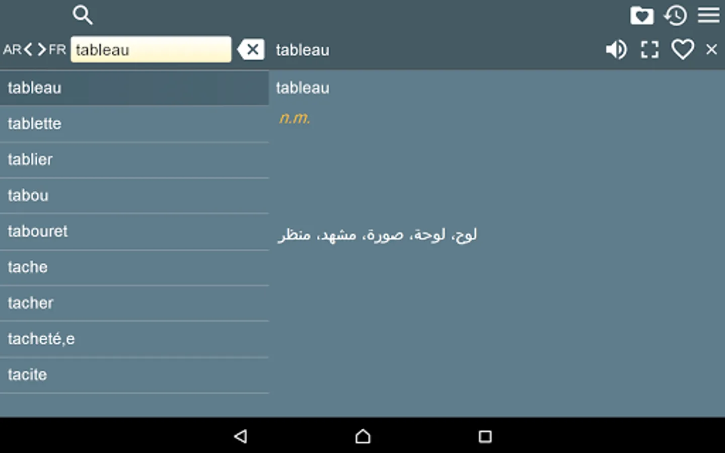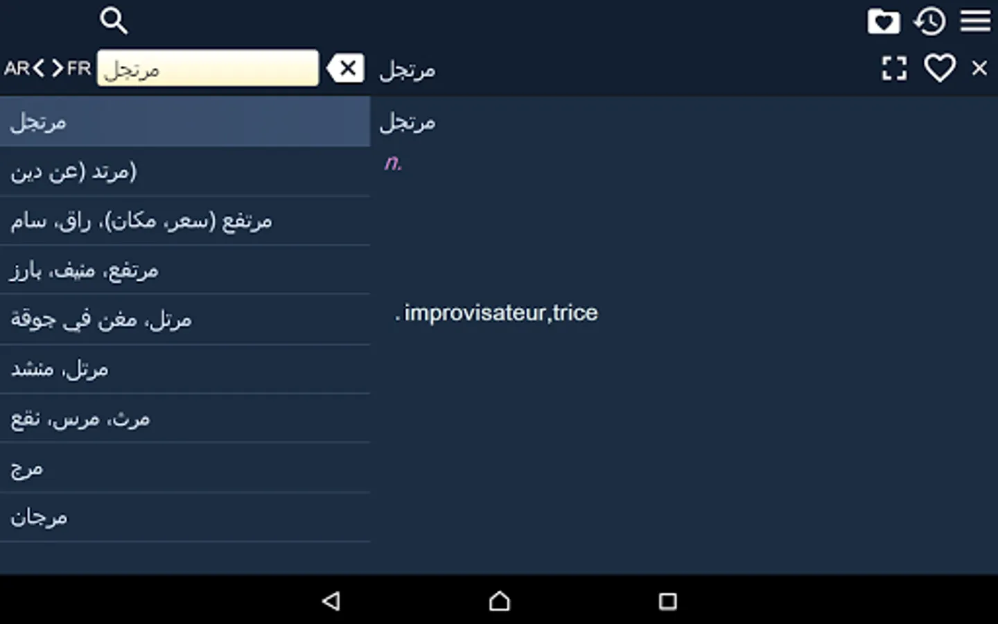 This is Arabic - French and French - Arabic Dictionary (Dictionnaire Arabe Français, قاموس عربي فرنسي), containing 28000 translation articles. The Dictionary is OFFLINE and does not need the internet connection.