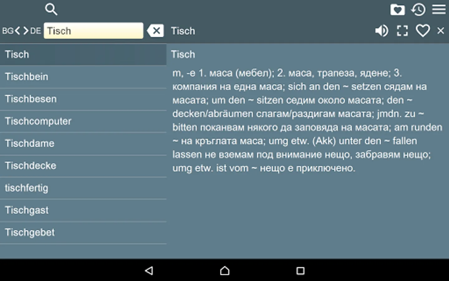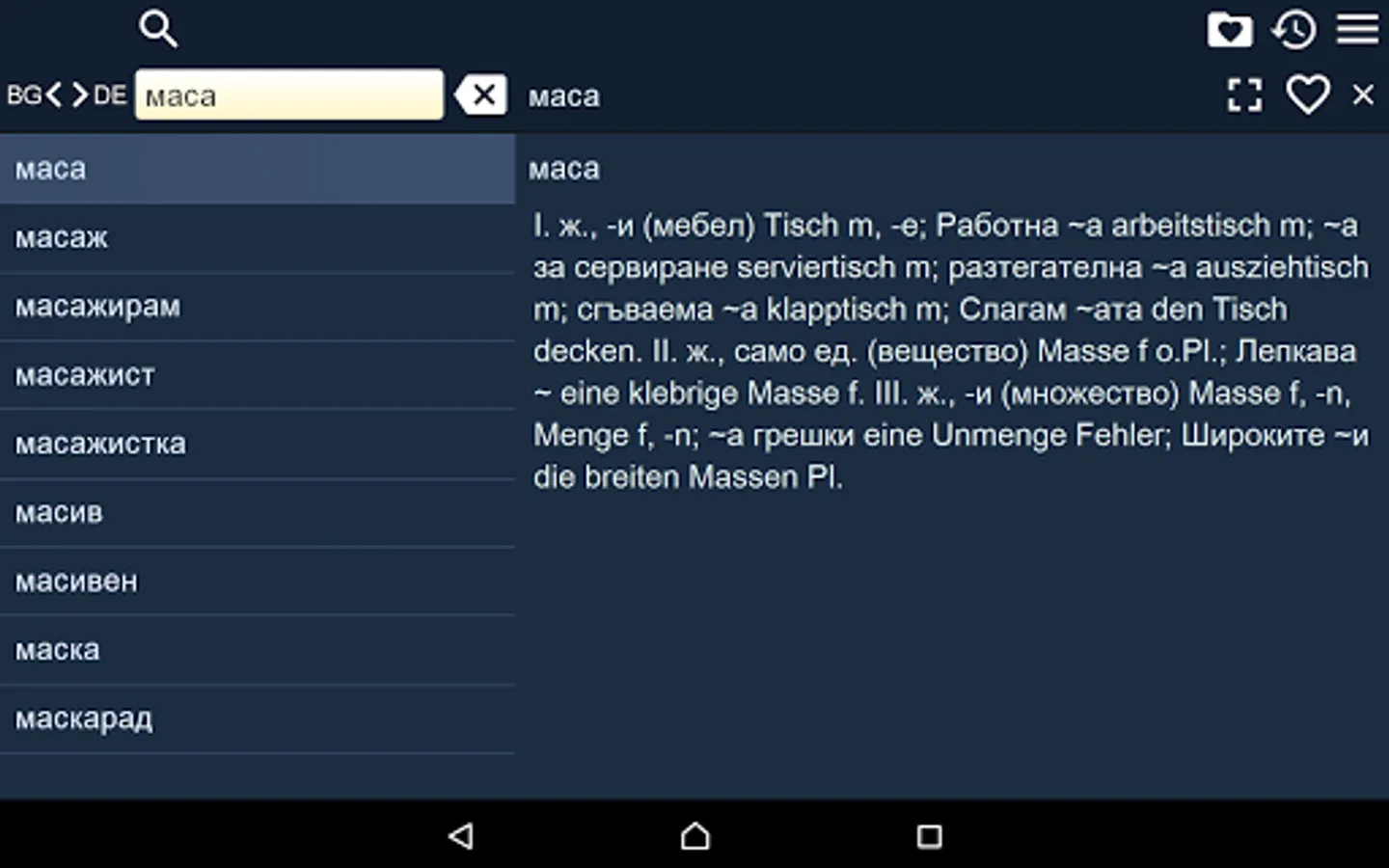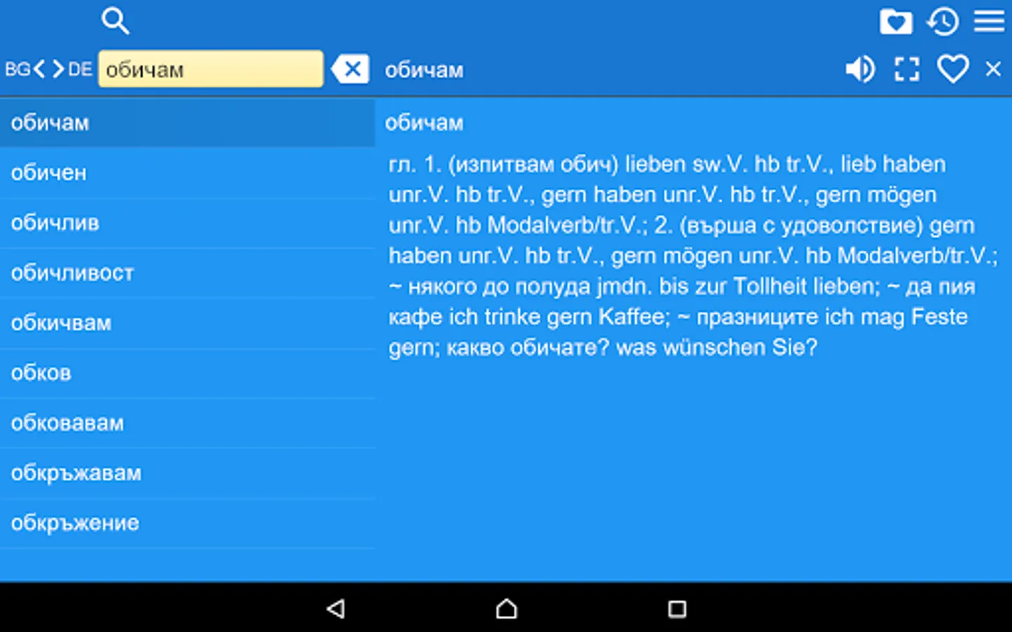 This is Bulgarian - German and German - Bulgarian Dictionary, containing 87000 translation articles. The Dictionary is OFFLINE and does not need the internet connection.