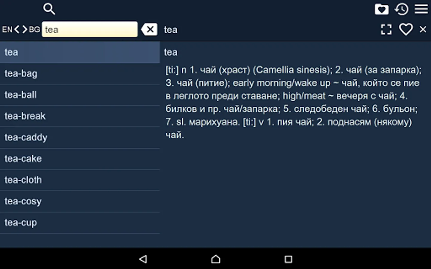 This is English - Bulgarian and Bulgarian - English Dictionary (Българо-английски и английско-български речник), containing 88000 translation articles. The Dictionary is OFFLINE and does not need the internet connection.