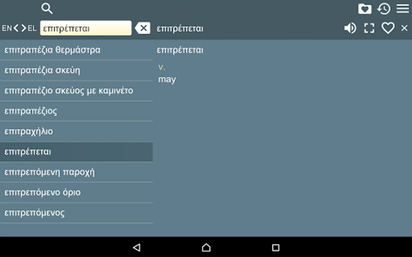 This is English - Greek and Greek - English Dictionary (Αγγλο-Ελληνικό και Ελληνο-Αγγλικό Λεξικό), containing 102000 translation articles. The Dictionary is OFFLINE and does not need the internet connection.