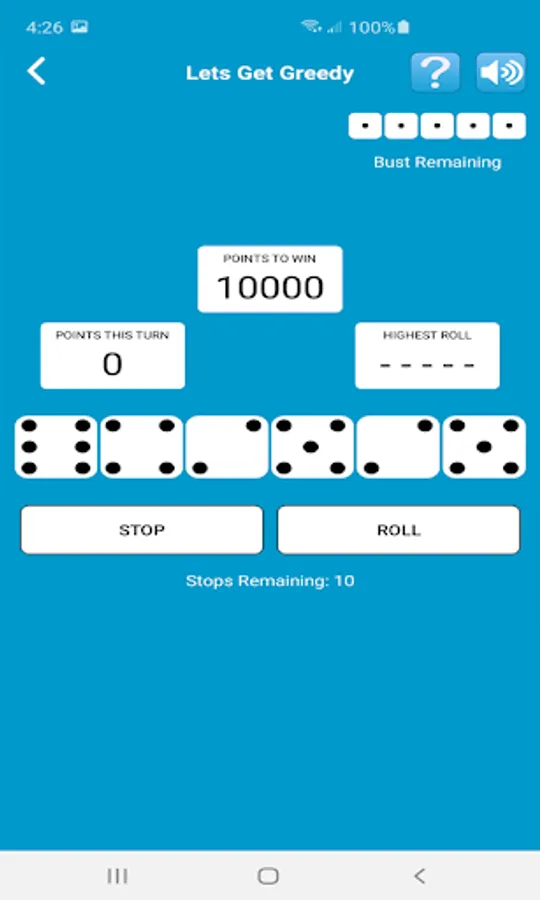 If none of the dice score in any given roll, the player has "busted" and all points for that turn are lost. Once a player has achieved a winning point total, busted 5 times or used all available stops the game is over.