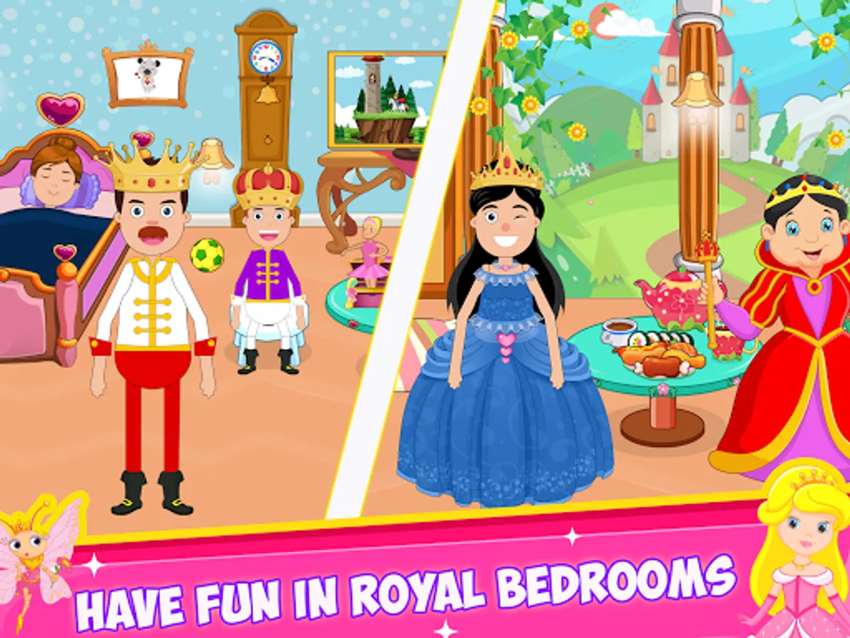 Kick start your royal castle adventure to become the most beautiful royal princess ever and enjoy a dollhouse game for girls. Enjoy cooking and styling in the princess salon while living in the princess royal fun castle and become a cute little princess of Mini Town.
