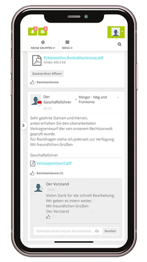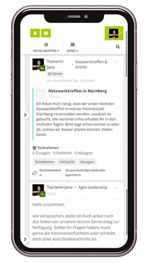 All participants in a master class group come together in this app. The content of the trainer is regularly made available here as a video or as texts, in which, for example, the relevant techniques that are to be implemented are described in detail and detailed application examples are given. Furthermore, feedback questions are posted as well as images and documents that are important for the transfer of learning.