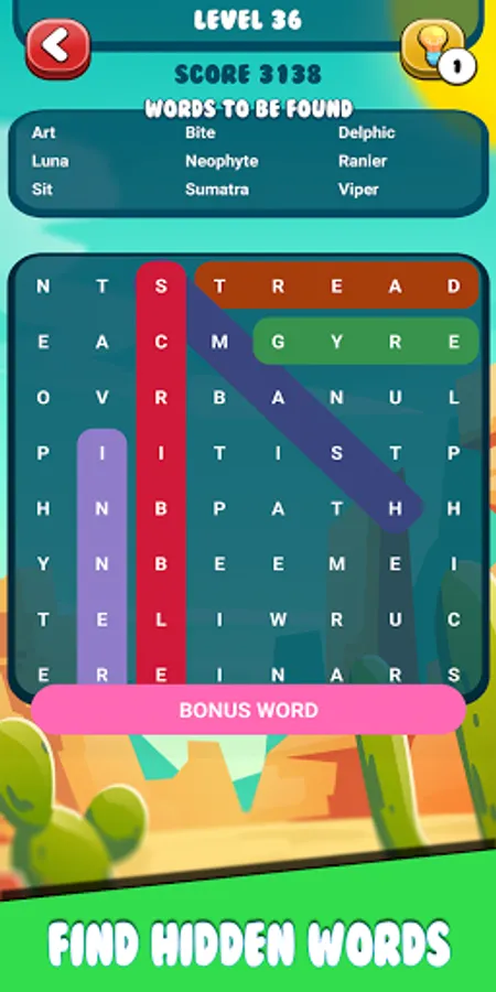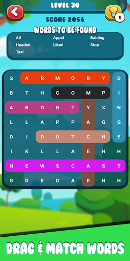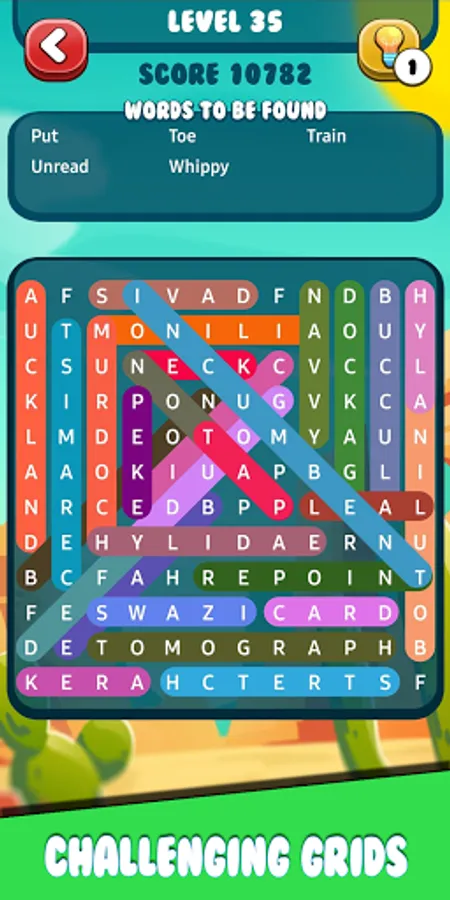 * Search and swipe letters to create words horizontally, vertically or diagonally.