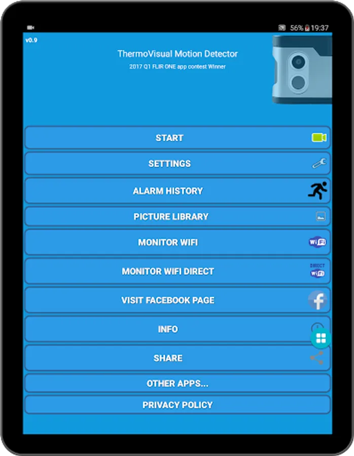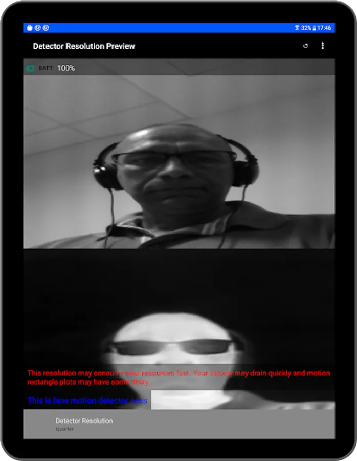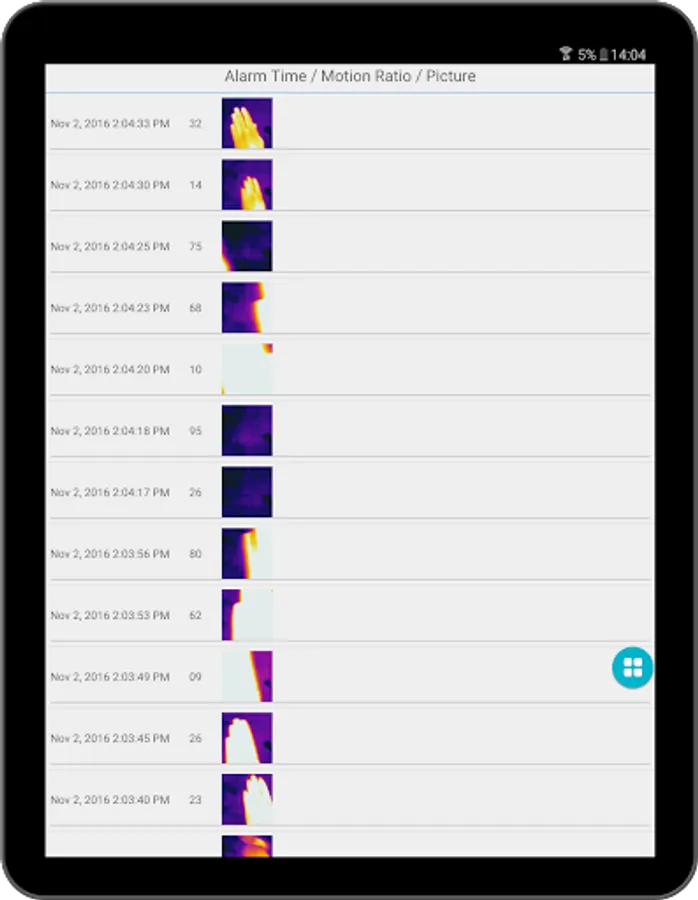 * The main problem with the motion detection applications is the shaking of the devices during the observation. Shaking devices yield false alarms. ThermoVisual Motion Detector application has specially designed algorithm to minimize this drawback. The app automatically stops motion detection in case of device vibration.