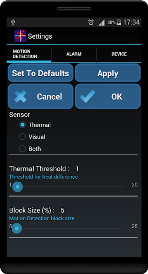 * ThermoVisual Motion Detector automatically detects any motion/change thermal, visual or both and plots them on your device screen.