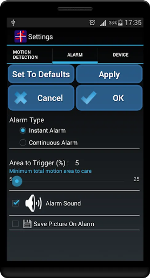 * TVMD displays motion icon in case amount of motion detected exceeds the threshold set by user. The app plays sound with the volume level proportional to the amount of motion detected.