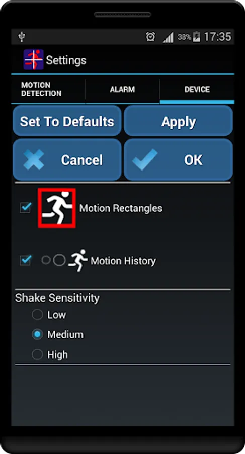 - Shake Sensitivity: Sensitivity level for device shaking. ThermoVisual Motion Detector stops motion detection in case of device shaking, therefore, prevents false alarms. User can select High, Medium or Low sensitivity.