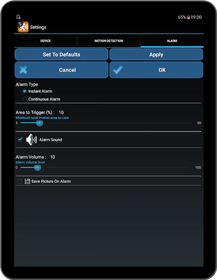 * Alarm Time To Trigger: Motion time period required to generate alarm.