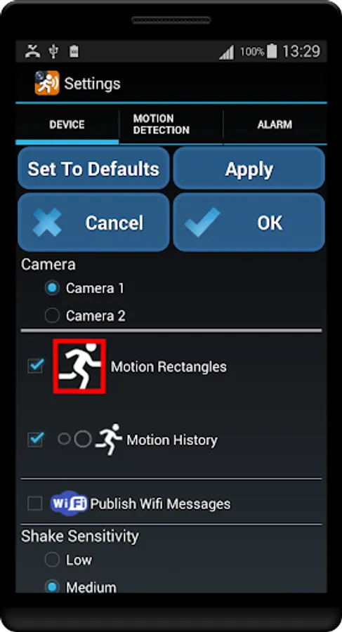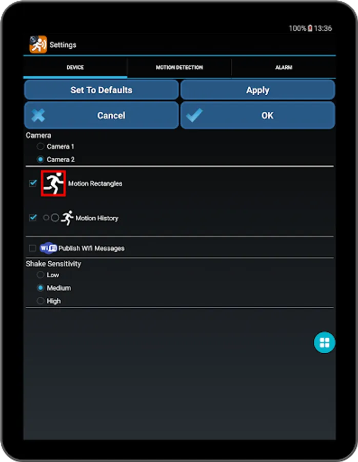 * Publish Wifi Messages: Monitor Motion Detector through the wifi network where available. Enables Wifi Publishing for the devices where this service is available. A device with this option checked publishes state information to other devices during motion detector operation.