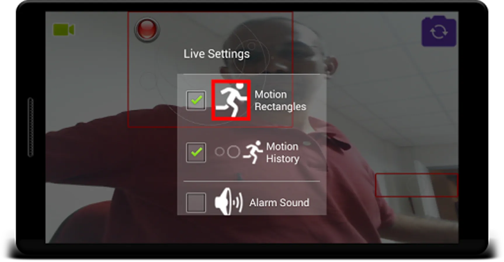 * Motion Detector automatically detects any motion or change and plot rectangles around them on the device screen.