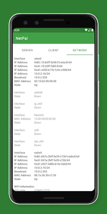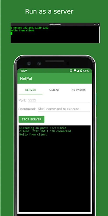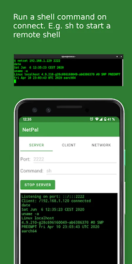 Running NetPal as a server also supports executing a shell command when client connects, e.g. starting a remote shell on the Android device. Note that the shell command will run with the same privileges as NetPal and, hence, may have restricted permissions.