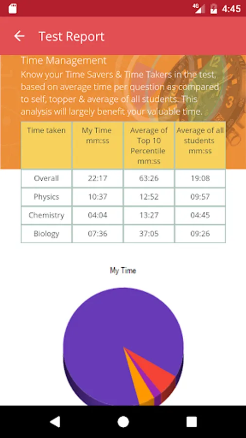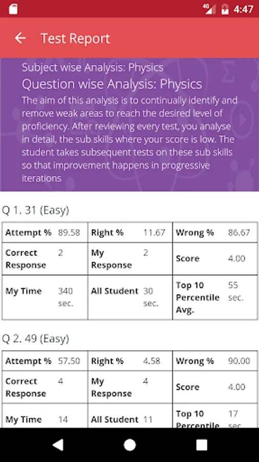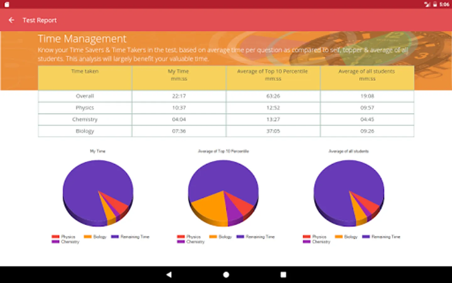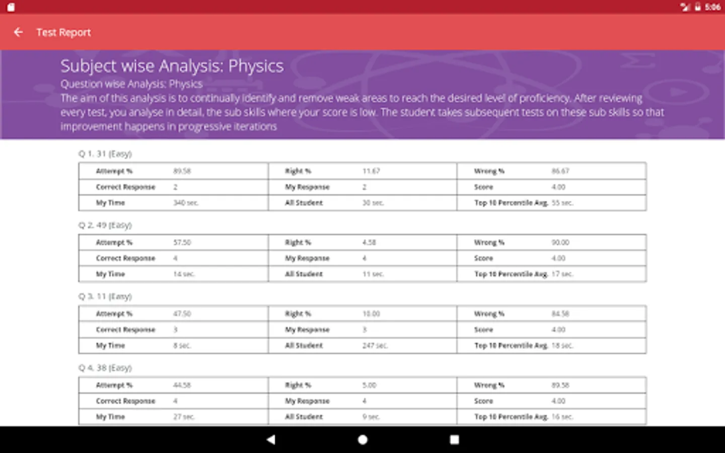 At the end of each test students get a detailed diagnostic test report with complete analysis. The report among other details lists-