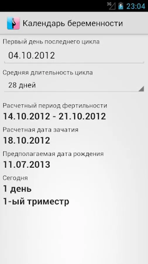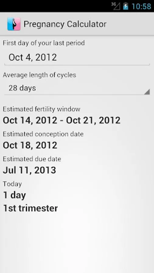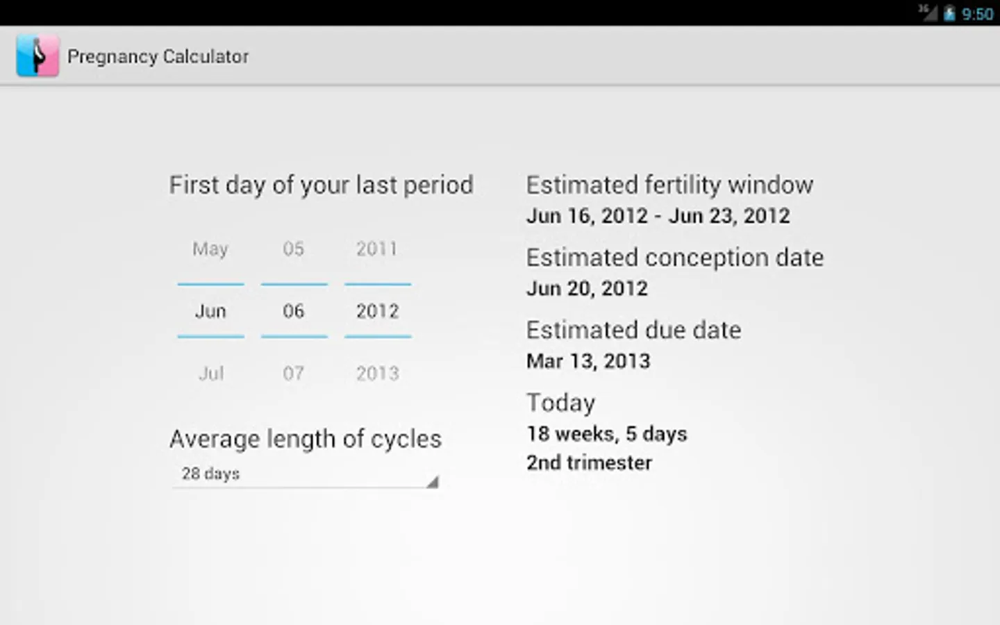 Download this Pregnancy Calculator on your device and you'll always be able to determine date of conception, how far along you are and the estimated due date of your baby. The calculations that are provided are estimates based on averages.