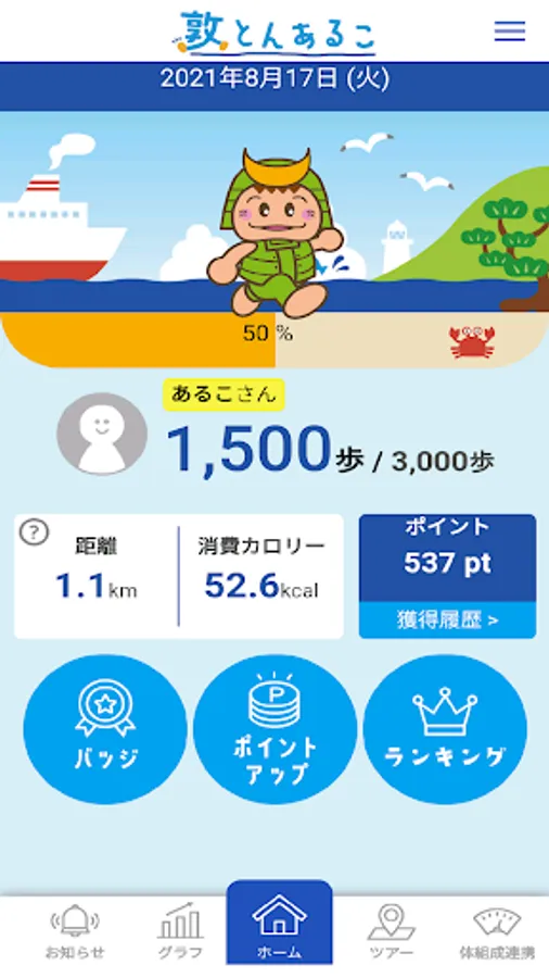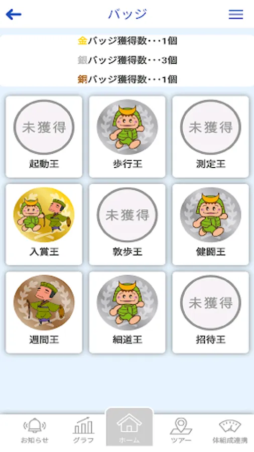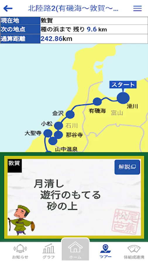 In addition to being able to display the number of steps taken each day in a graph, a ranking function for each individual and group according to the number of steps taken, a point-giving function for receiving prizes, a virtual tour function for the "Okunohosodo" traveled by Basho Matsuo, etc. There is a function that allows you to continue working on health promotion while having fun with Tsunuga.
