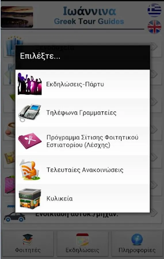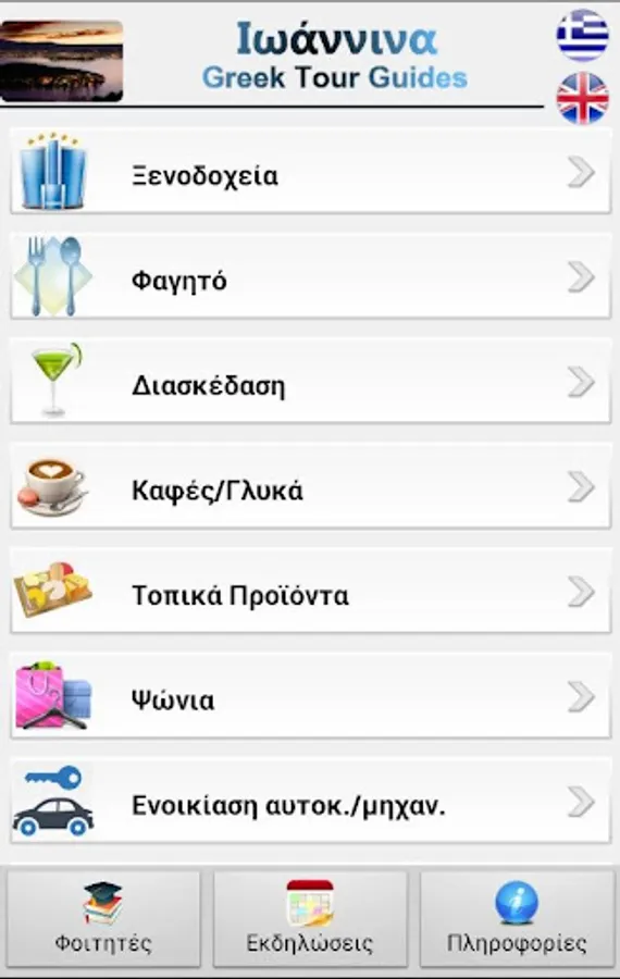 Ioannina Greek Tour Guides is an application that guides you and proposes solutions during your stay in the city of Ioannina. Also it recommends destinations and attractions that anyone deserves to visit .Furthermore it provides information about the events that are taking place in the city of Ioannina. Also for the college students provides information about the university departments communication, university coffee shops, the feeding program , the recent announcements of the university as well as for student events.