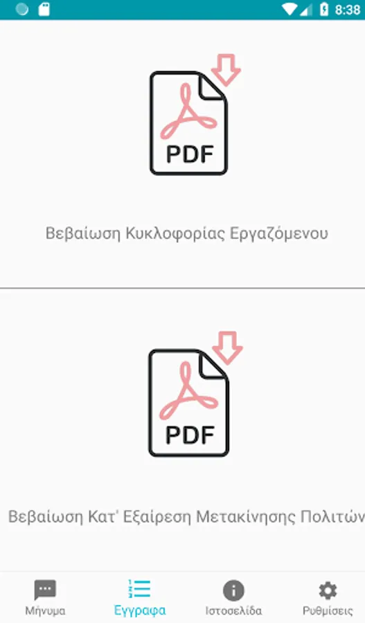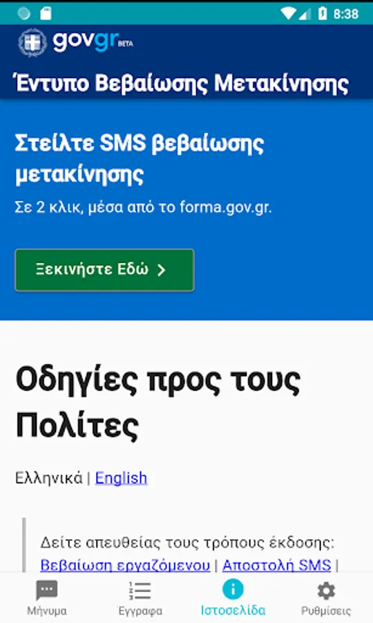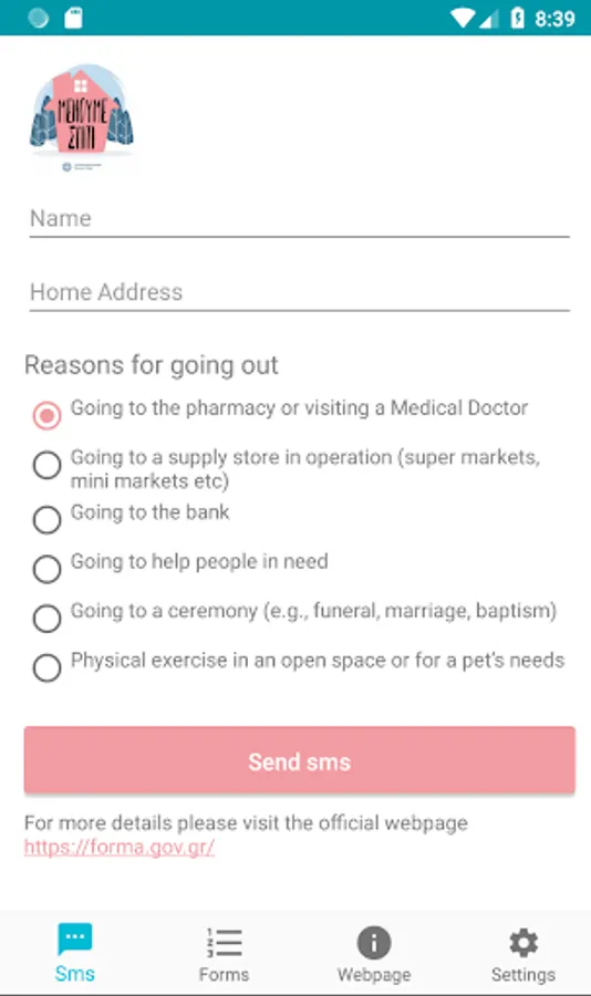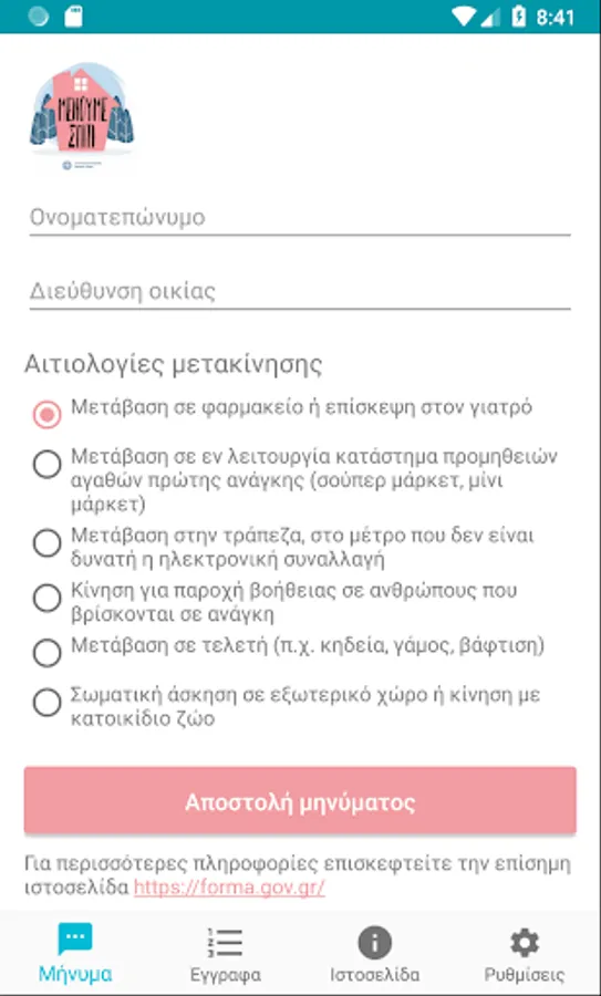 Citizens' sms during limited traffic in 13033 in Greece. By selecting the appropriate code and reason, your application prepares the message to be sent. Items are also stored locally for your next move.