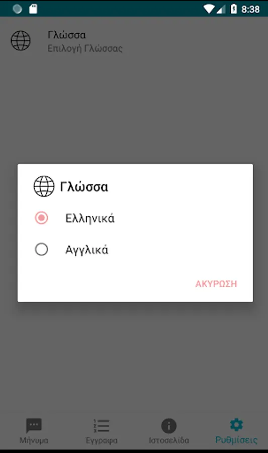 The application supports Greek and English.