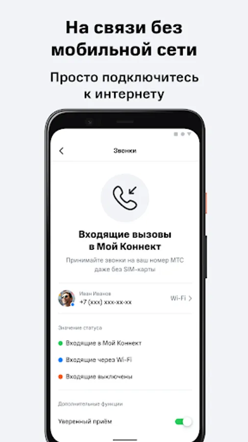 My Connect is a tool for those who want to use wifi calls, calls over the Internet, who make a lot of calls to MTS or often communicate with loved ones in roaming. When connected to Wi-Fi, you can call anywhere, and you do not need a mobile network at all.