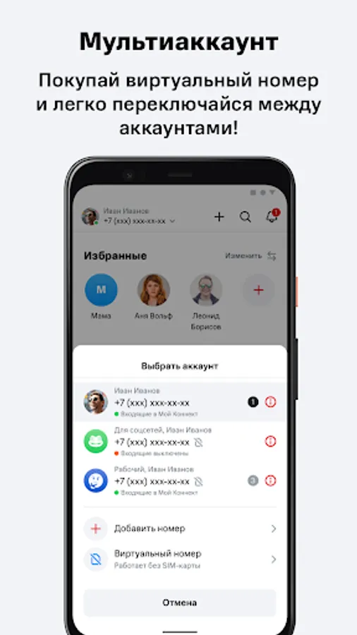 • Virtual number. From it you can make and receive calls, send and receive SMS. Useful if you do not want to disclose your main number or want to separate personal and work communication. And you can purchase a number in "My Connect".