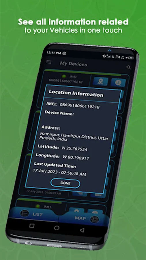 • Get details about the vehicle in use such time of journey, GPS Battery level & signal strength