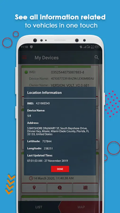 • Get details about the vehicle in use such time of journey, GPS Battery level & signal strength