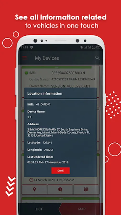 • Get details about the vehicle in use such time of journey, GPS Battery level & signal strength