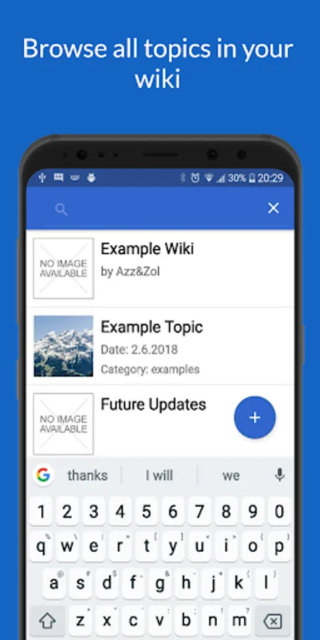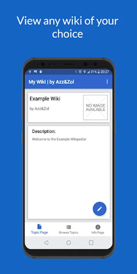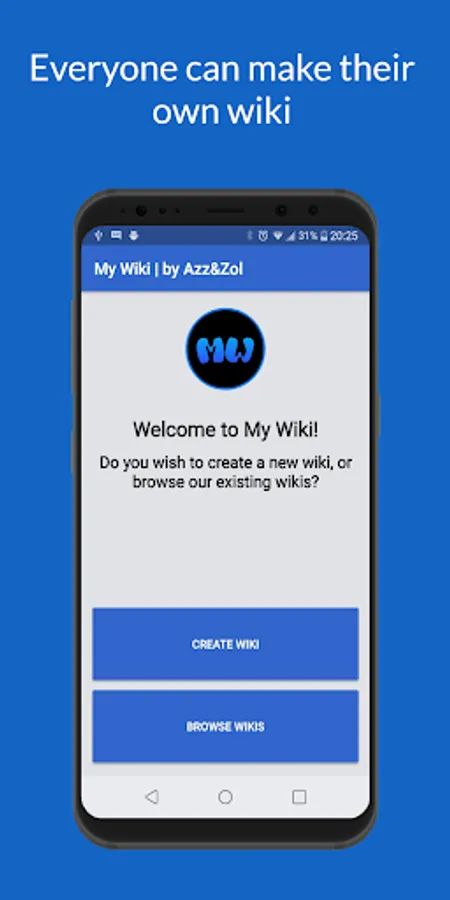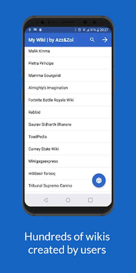 In this app you can create your own wiki about any subject you desire, and browse wikis the other users created. You can add new topics to your wiki, edit topics or delete them. Every wiki is saved on a cloud, which means that if you uninstall the app, none of the wikis you have created will be affected.