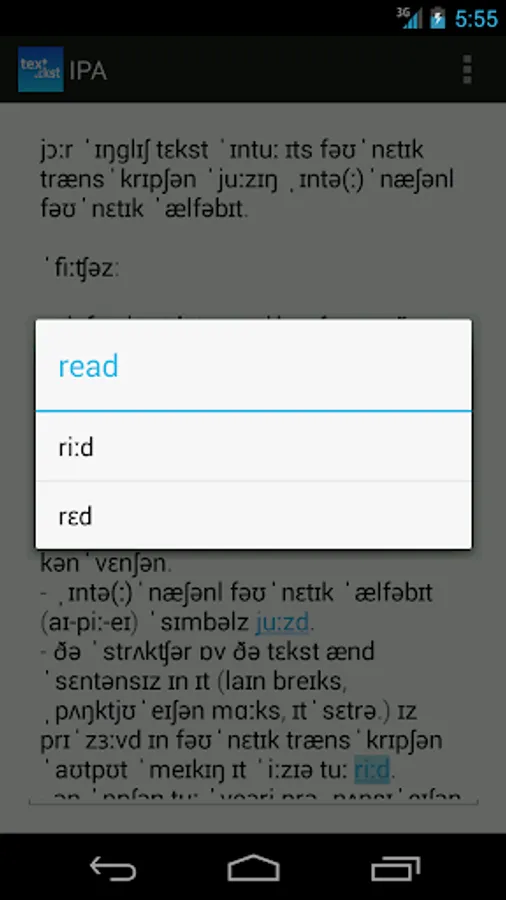 - Where a word has a number of possible pronunciations (highlighted in blue in the output) you can select the one that agrees with the context by tapping on it.