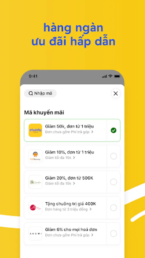 With an ecosystem of thousands of partners in more than 20 different industries such as: Fashion, beauty, learning, travel, dining, entertainment, health..., Muadee by HDBank will help you get more the option to buy now in installments, thereby getting closer to unfinished goals. Besides, attractive promotions will always be updated, helping you not only shop smart but also save more.