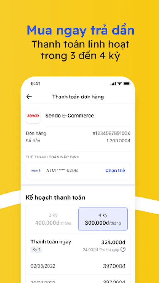 Muadee by HDBank helps you to immediately own your favorite products and services by dividing the invoice value into 3-4 payment periods. At the time of purchase, you only need to pay 1/3 or 1/4 of the order value and a small fee to immediately own the desired product or service. The remaining payment periods will be "stretched" and you can pay in 3 - 4 months.