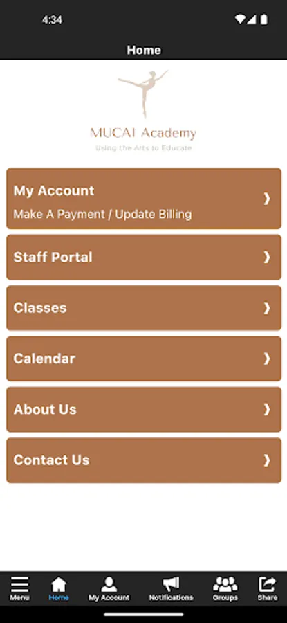 The MUCAI Academy app allows you to manage your account with ease, register for classes, parties, and special events. You'll also receive important notifications about class changes, closings, registration openings, special announcements, and upcoming events.