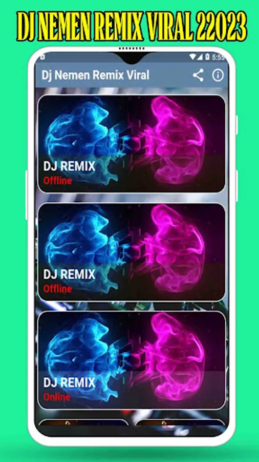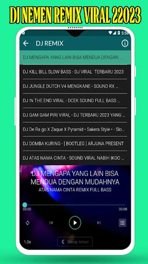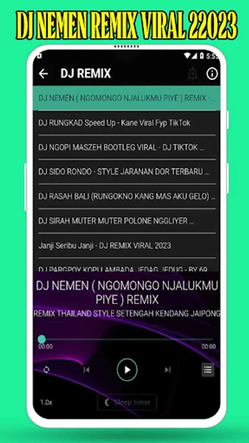 This application is a music player application which contains a collection of viral DJ songs, one of which is Dj Nemen Remix Viral, and many other viral DJs. This application can be played offline and is perfect for listening to everyday because this application is very light and has clear audio quality