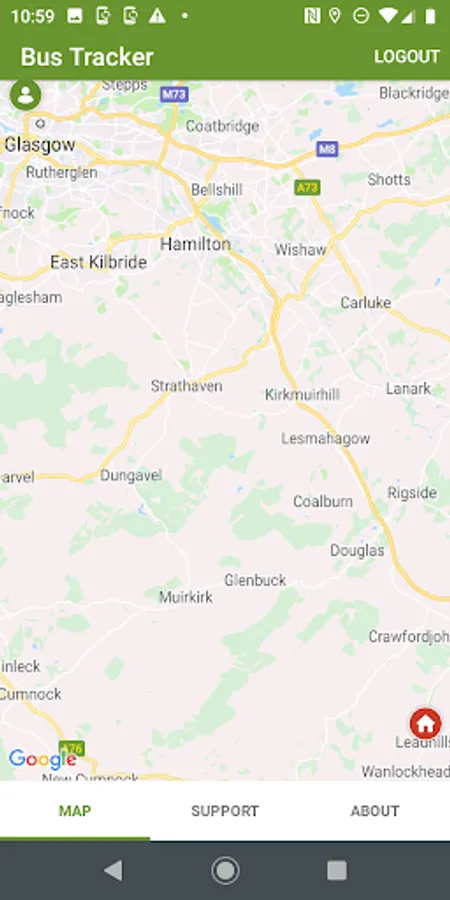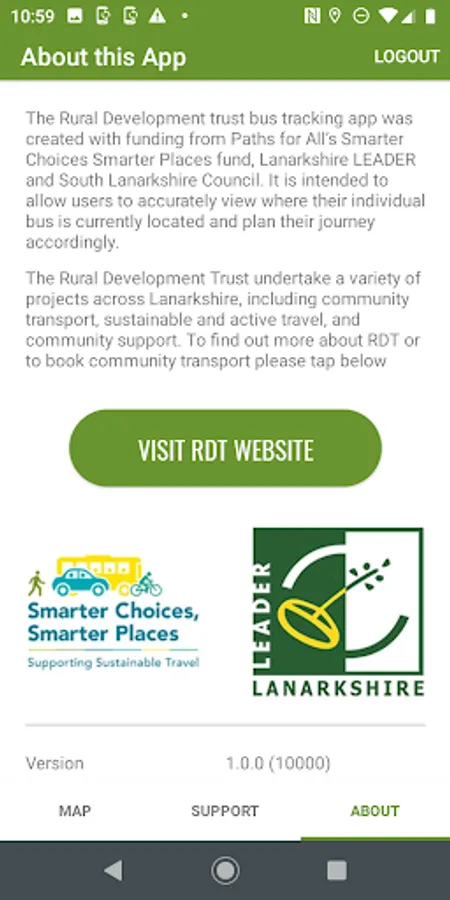 Available to registered users only, the Bus Tracker app allows users of Rural Development Trust busses to track and locate their bus, view their stops and their own location.