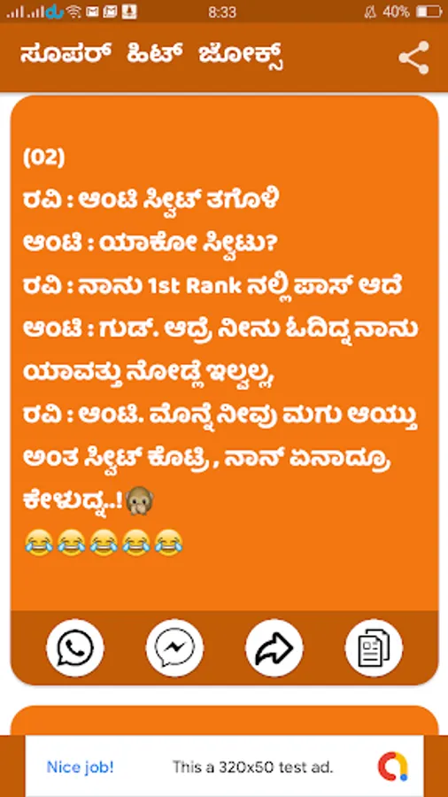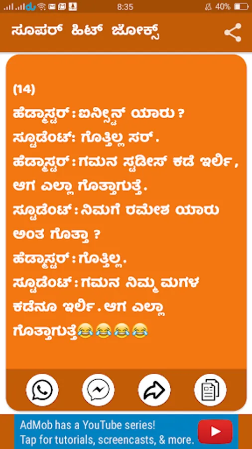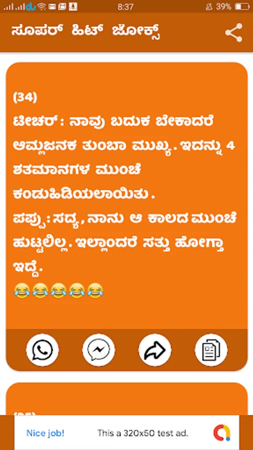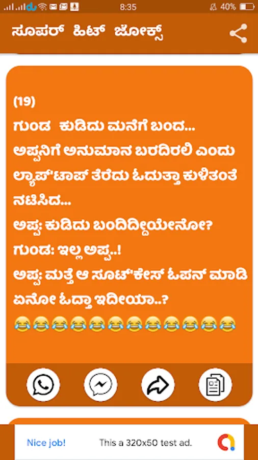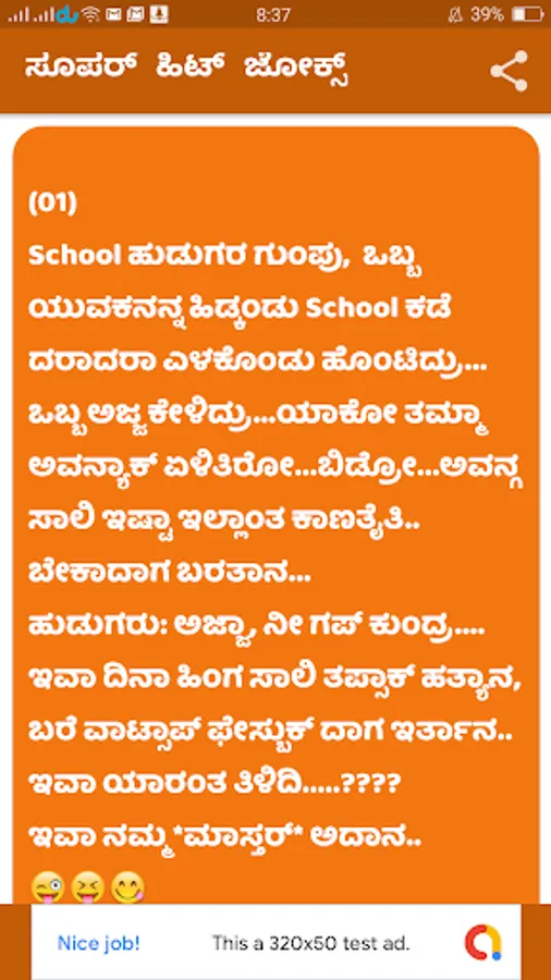 this app is built in kannada this app contains more then 800 kannada jokes and its fully funy and enjoyment.