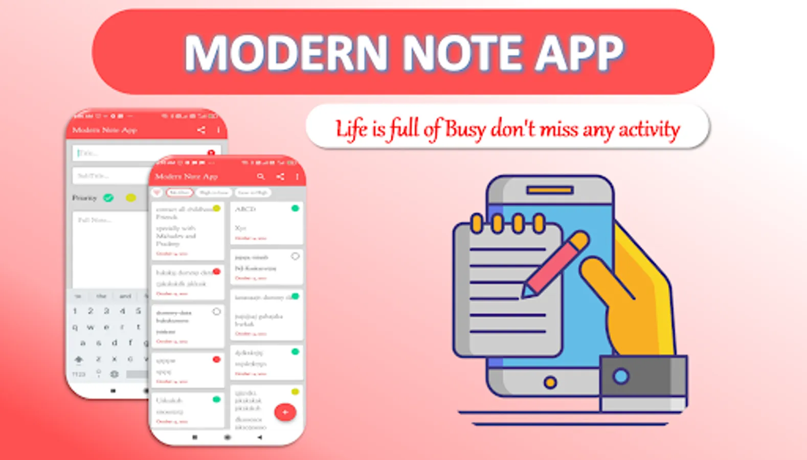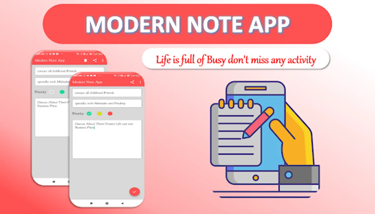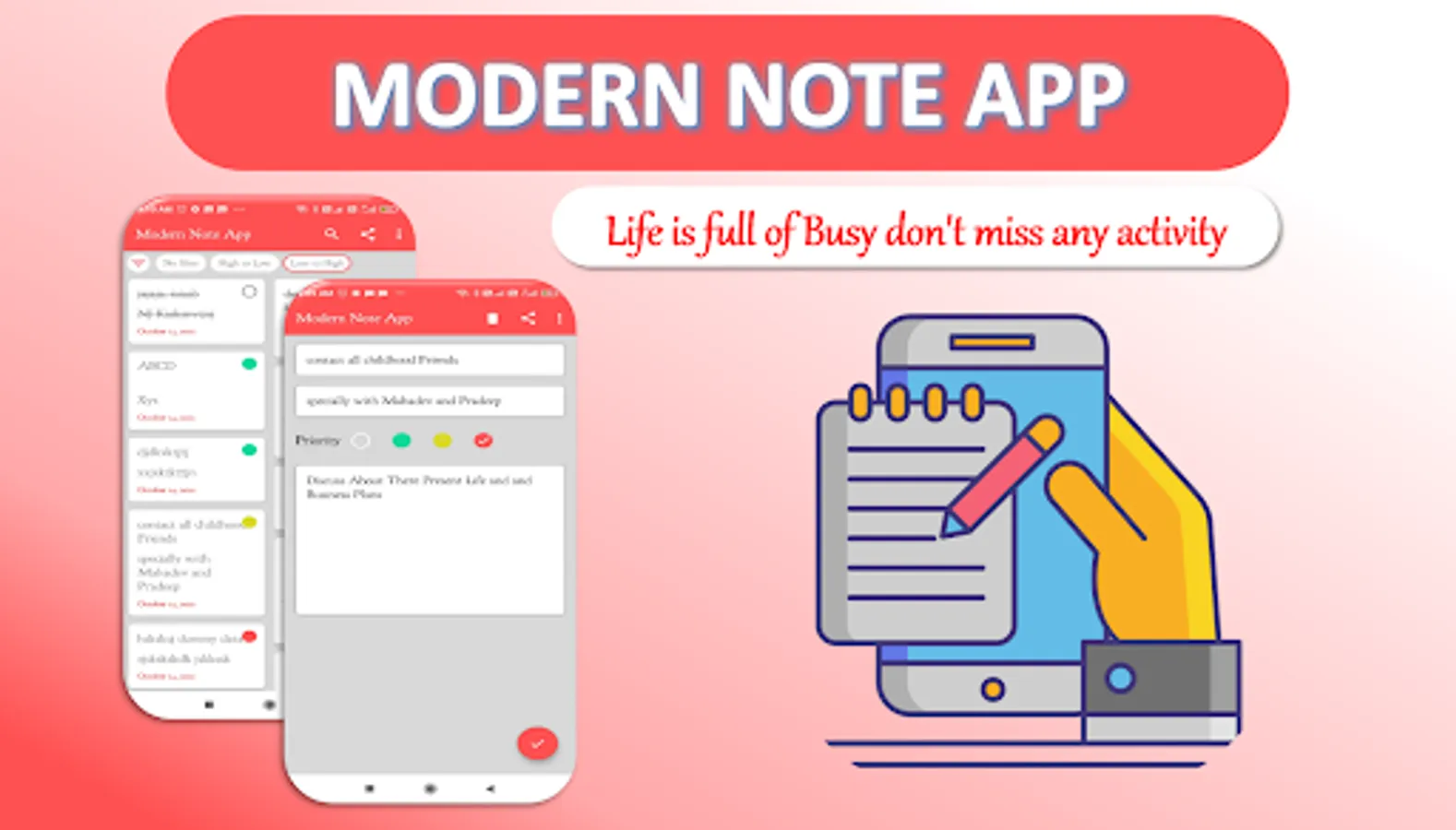 As Name indicates this is the modern Note taking app, in this you can easily Create Notes, Edit Notes, Delete Notes and You Can set Priority also like green Priority, yellow priority or red Priority and more amazing priority option is available in this app that’s No priority.